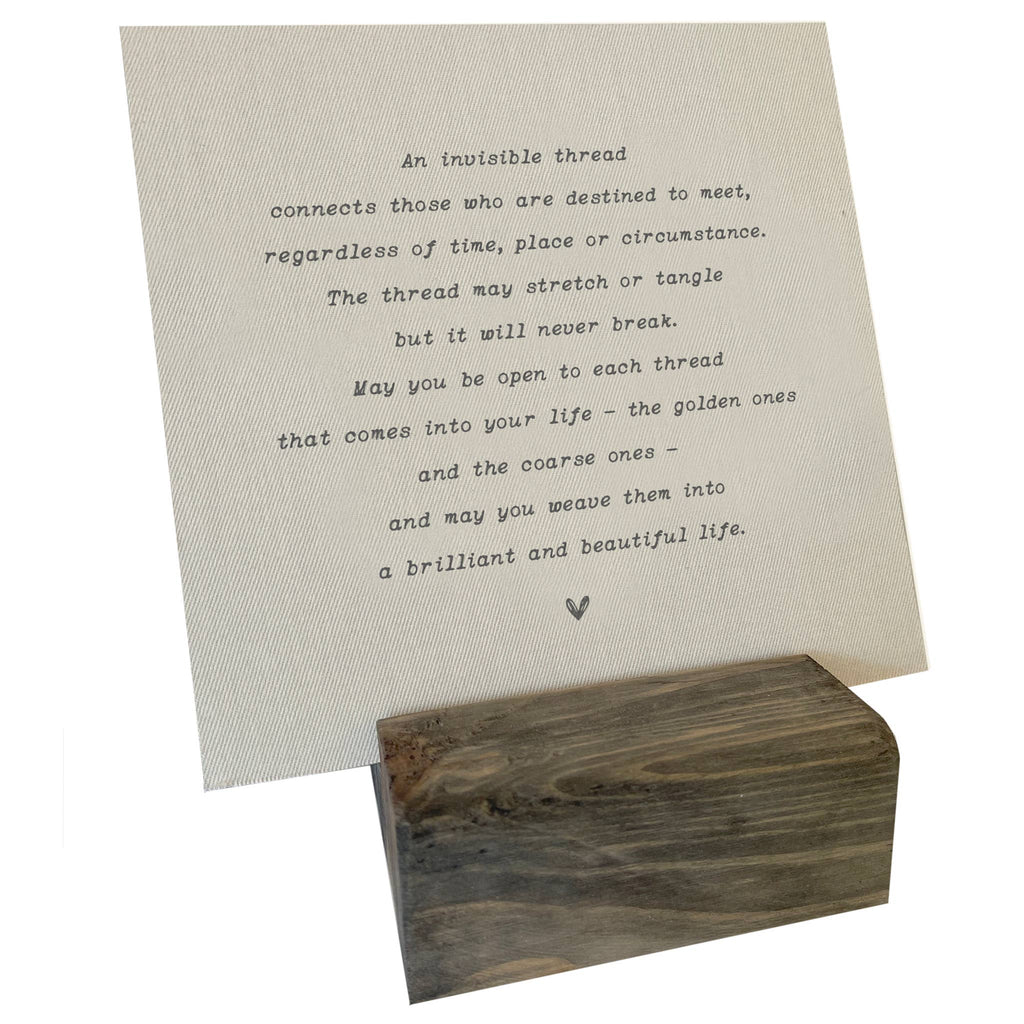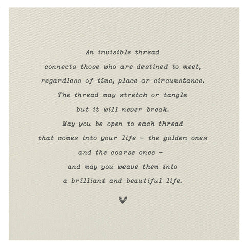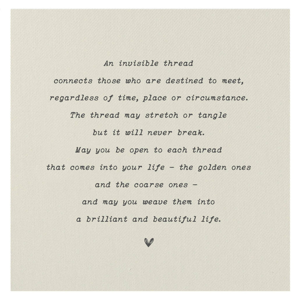 An invisible thread connects those who are destined to meet, regardless of time, place or circumstance. The thread may stretch or tangle but it will never break. May you be open to each thread that comes into your life - the golden ones and the coarse ones - and may you weave them into a brilliant and beautiful life. D E T A I L S • Holders sold separately. • 7”x7” cotton canvas fabric adhered to a 1/4” masonite board • logo stamped on back and canvas wrapped in cellophane for protection