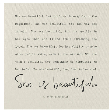 She was beautiful, but not like those girls in the magazines. She was beautiful, for the way she thought. She was beautiful, for the sparkle in her eyes when she talked about something she loved. She was beautiful, for her ability to make other people smile, even if she was sad. No, she wasn't beautiful for something as temporary as her looks. She was beautiful, deep down to her soul. She is beautiful. - F. Scott Fitzgerald D E T A I L S • Holders sold separately. • 7”x7” cotton canvas fabric adhered to a 1/4” masonite board • logo stamped on back and canvas wrapped in cellophane for protection