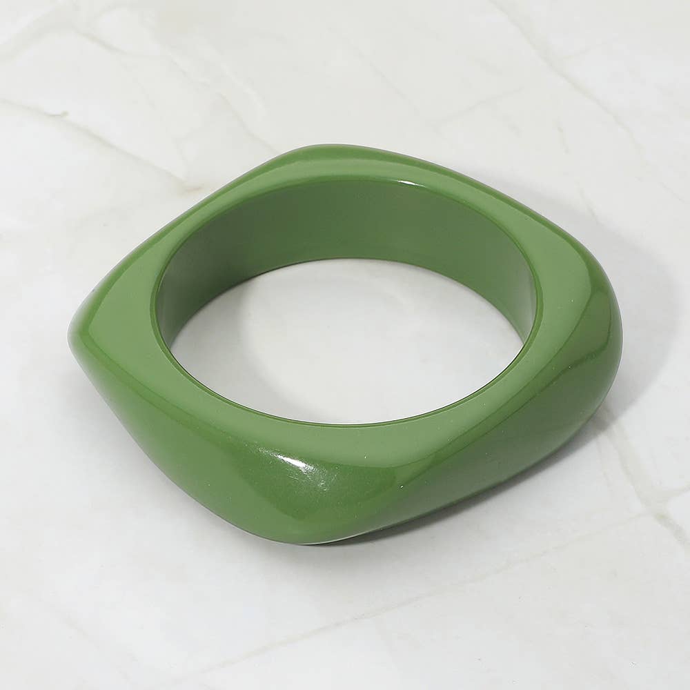 This bold resin bangle bracelet showcases a sculpted square silhouette with a glossy marbled finish for a modern, artistic appeal. Its smooth surface and rich tones make it a standout accessory that adds a touch of sophistication and creativity to any casual or statement look.