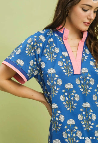 Printed Split Neck Short Sleeve Shift Dress