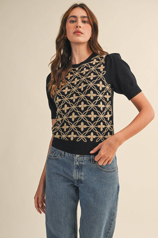 This short sleeve embroidered sweater is on the top of our Fall must-have list! Lightweight knit makes up this cute sweater with a round neckline and short puff sleeves. Darling floral embroidery decorates the relaxed-fit bodice that ends in a ribbed hem, perfect to wear with high-waisted bottoms! + Short puff sleeve embroidered sweater + Round neckline + Short puff sleeves + Relaxed fit pullover + Lightweight knit + All-over embroidery design on front + Ribbed neckline, cuffs, and hem + Model is 5' 10.5” 32-24-36 and wears a S