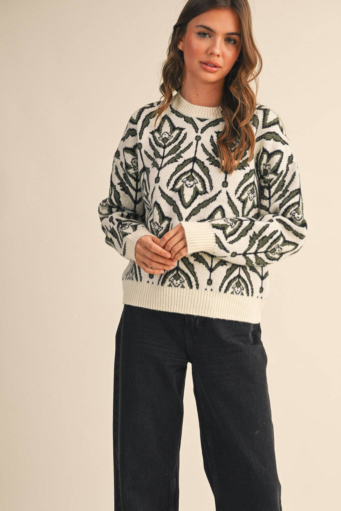 + Floral pattern knit sweater + Ribbed round neckline, hem, and cuffs + All-over floral knit + Drop shoulder long sleeves + Relaxed fit pullover + Model is 5' 7.5" 30-25-36 and wears a S