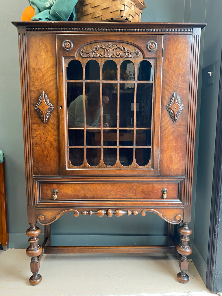 Meet Amelia: This beautifully detailed wooden Jacobean Revival cabinet features one drawer below and a central cabinet with three shelves framed by intricately carved panels. The wood grain on the front is particularly lovely!