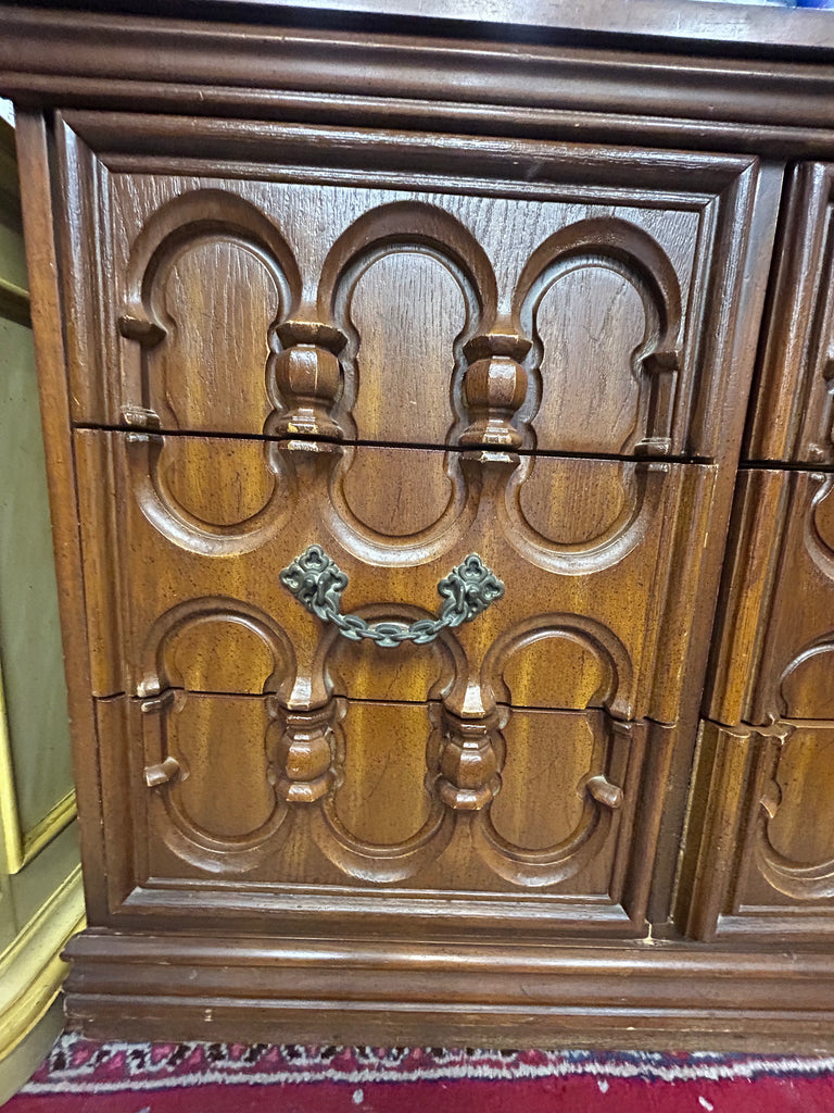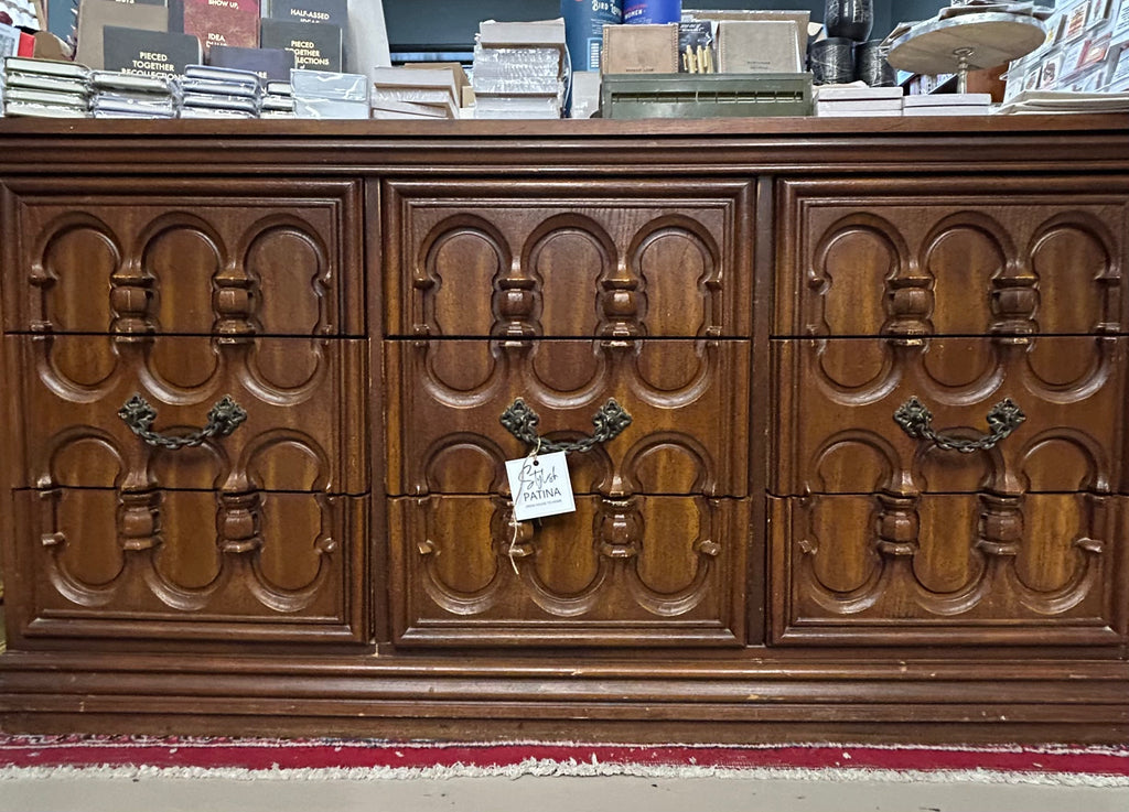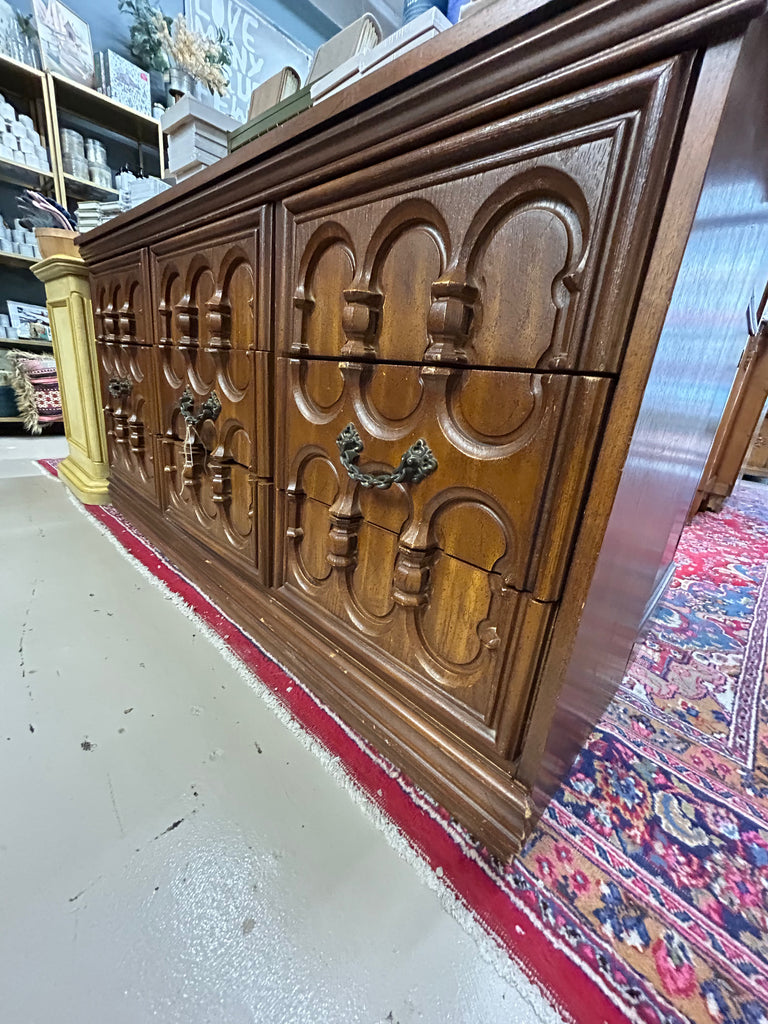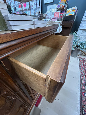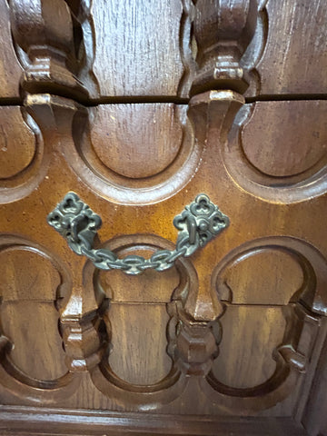 Elevate your space with this richly detailed wooden cabinet, a true statement piece for lovers of craftsmanship and character. Featuring three symmetrical carved panels, each adorned with intricate scrollwork and floral motifs, this cabinet blends old-world elegance with practical charm. The central note—“Each Drawer Pulls Out”—reveals a delightful surprise: hidden storage behind each panel, perfect for stashing treasures or organizing essentials with flair.