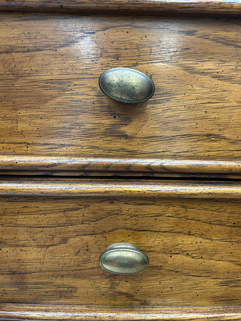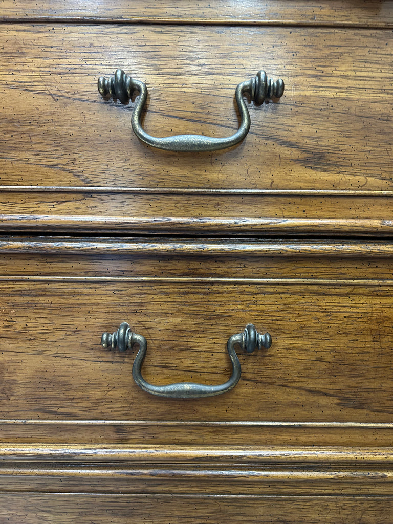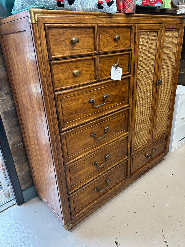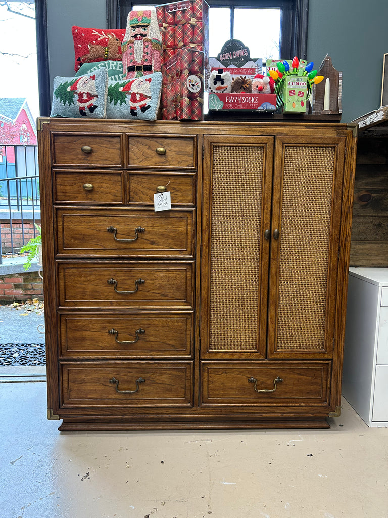 Meet Bert: Vintage dresser by Burlington Furniture Industries, United Division — crafted in Lexington, NC. Features a woven rattan-style cabinet, ten drawers in varied sizes, and warm wood tones ideal for retro-inspired interiors.