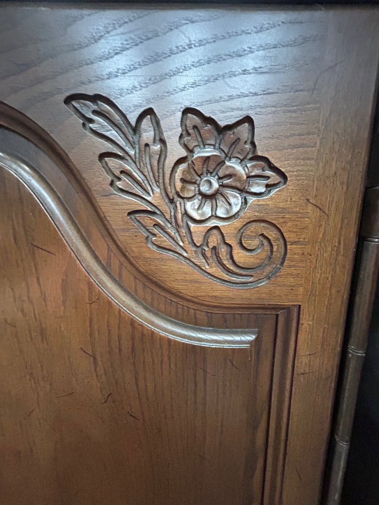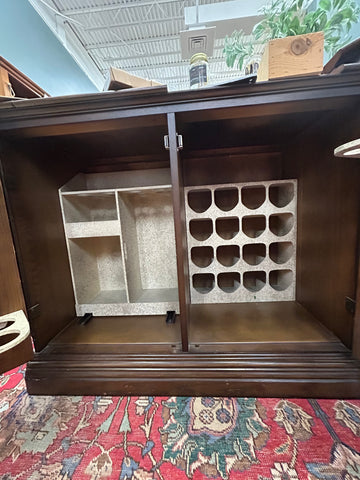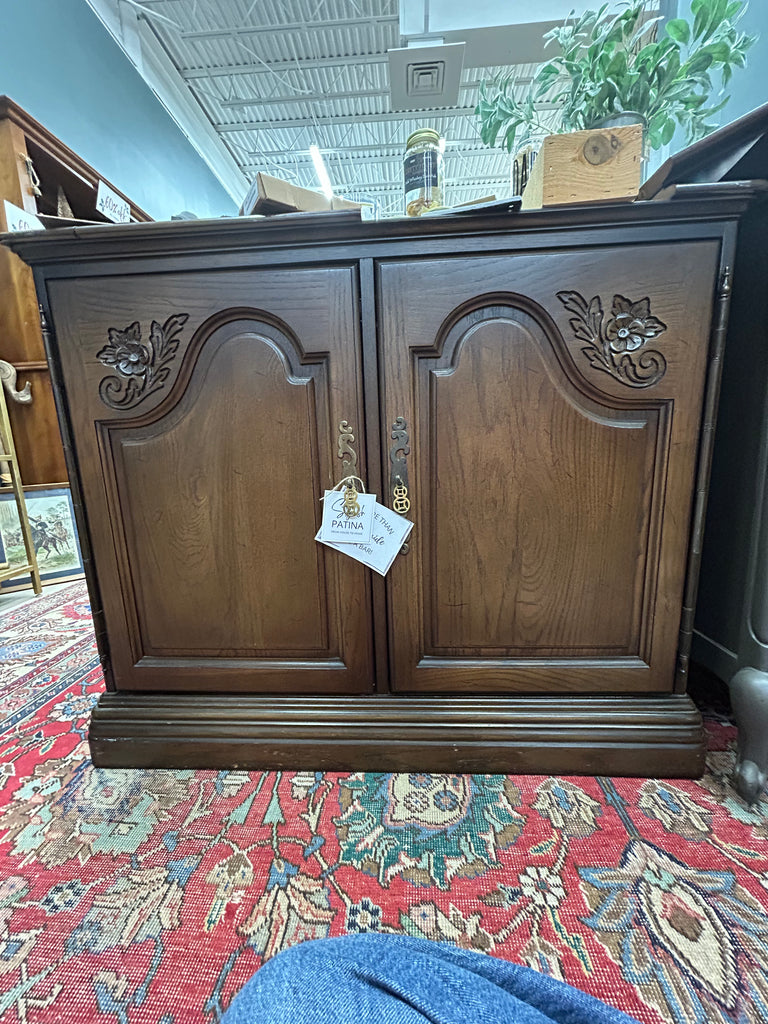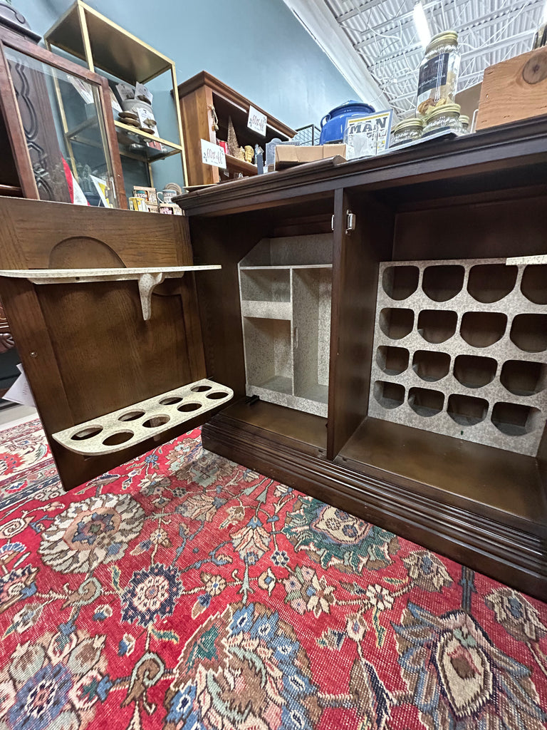Meet Casey: Vintage Carved Bar Cabinet. Solid wood bar cabinet with detailed carved doors and brass hardware. Interior includes: