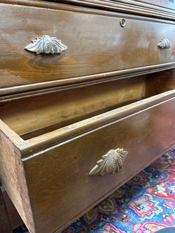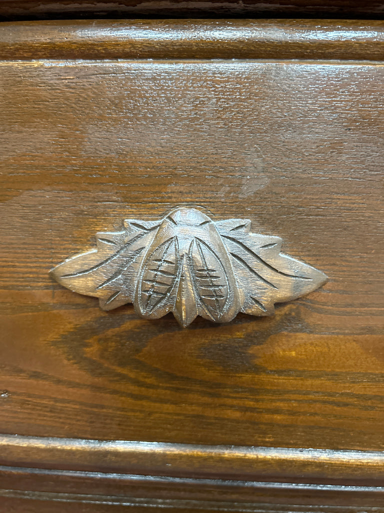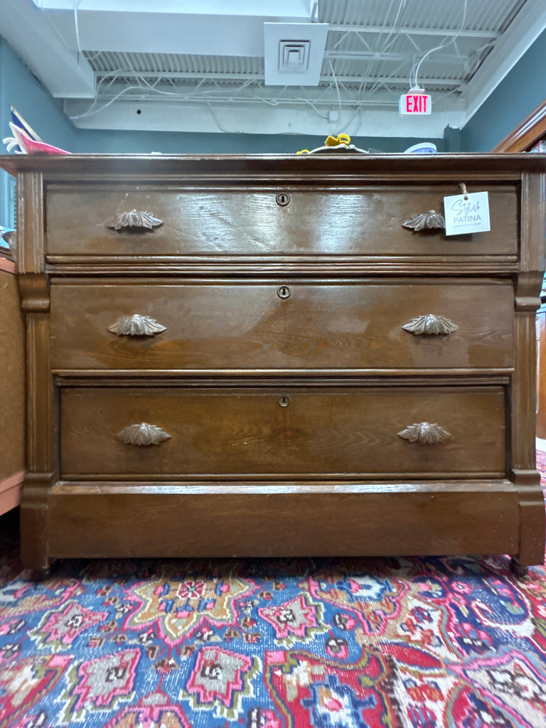 Meet Annette: This vintage wooden dresser brings timeless character to any space. Featuring three deep drawers adorned with ornate leaf-shaped metal handles and classic keyhole details, it's a piece that whispers stories of craftsmanship and heritage. The rich, dark brown finish highlights the natural grain, while its sturdy silhouette anchors the room with warmth and sophistication.