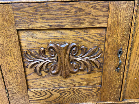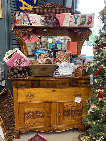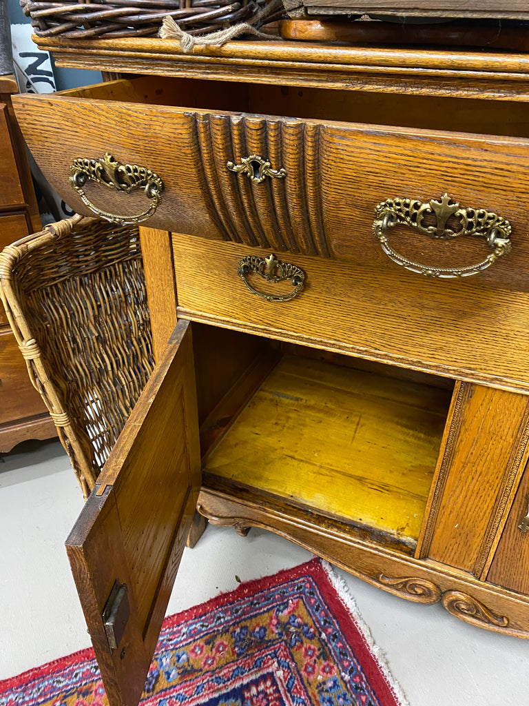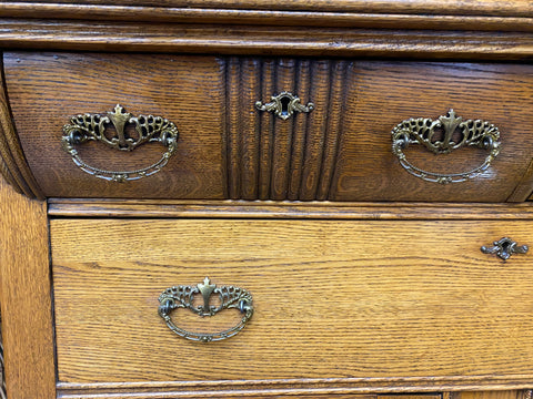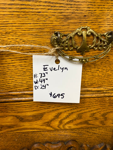 Meet Evelyn, a gorgeous vintage dresser/cabinet with ornate carvings, brass fixtures, and an attached mirror. Evelyn has 3 drawers and cabinet beneath, keys to locks included.