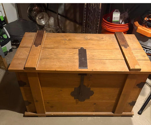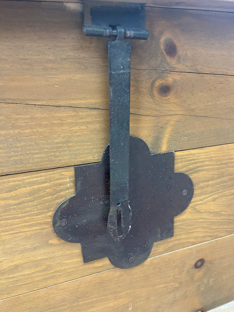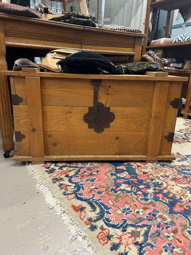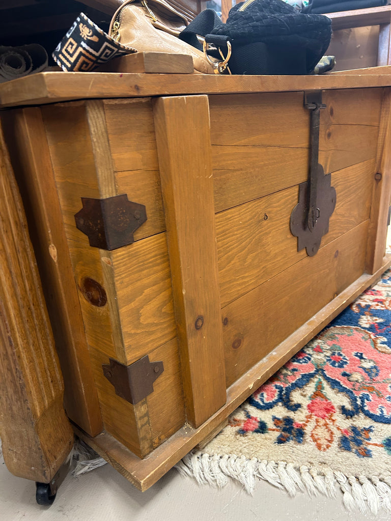 Meet George: This vintage wood chest is a statement piece with soul. Crafted from thick planks and reinforced with dark metal hardware, it channels old-world craftsmanship and workshop grit. The aged patina and industrial accents—hinges, latch, and top-mounted metal plates—add depth and character, making it perfect for storing tools, blankets, or treasures with a story. Use it as a coffee table, entryway anchor, or bold accent in a curated space.