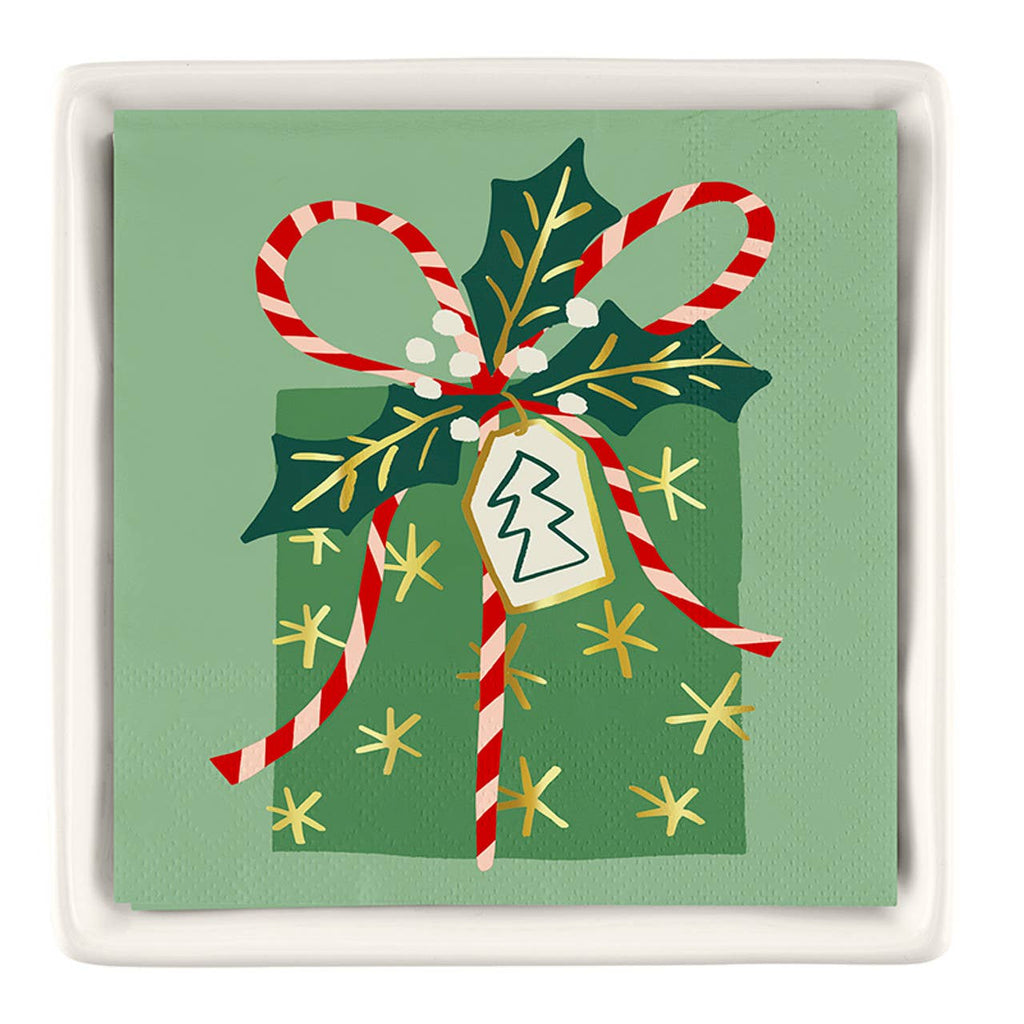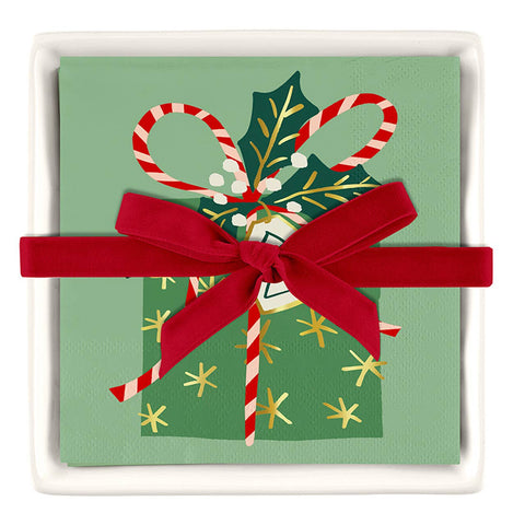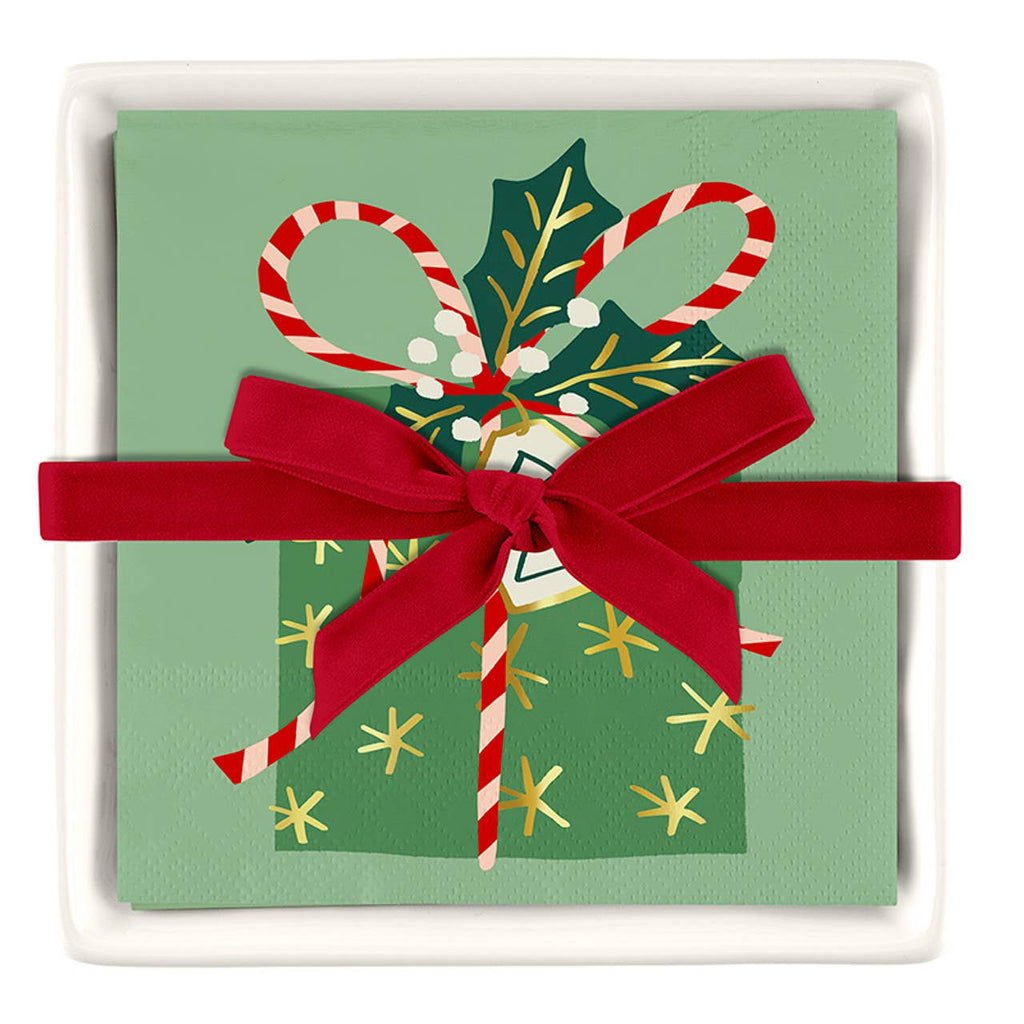 This ceramic napkin tray with paper cocktail napkins is a stylish and practical accessory for organizing and presenting napkins during social gatherings or special occasions. Has a touch of velvet to elevate the look!