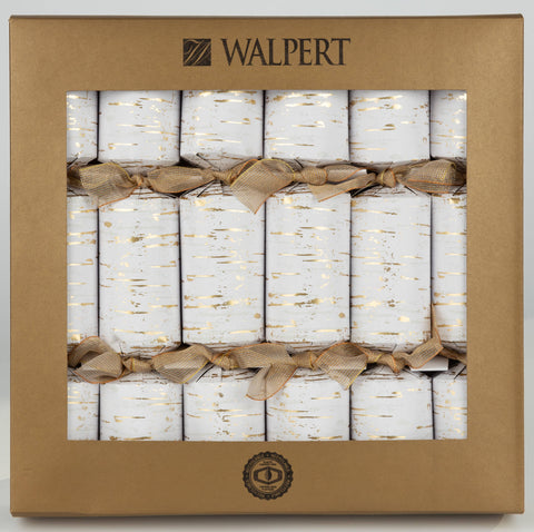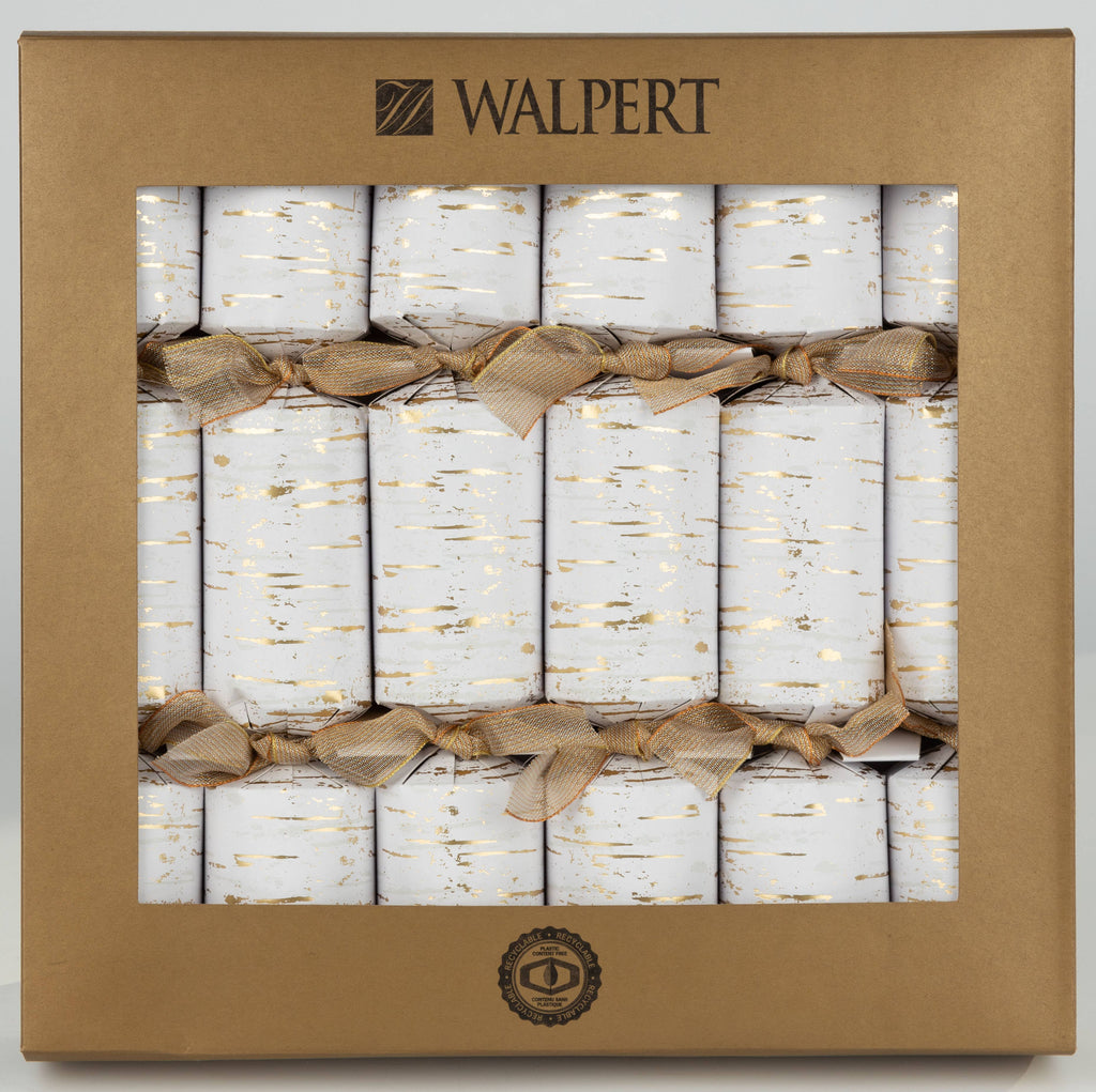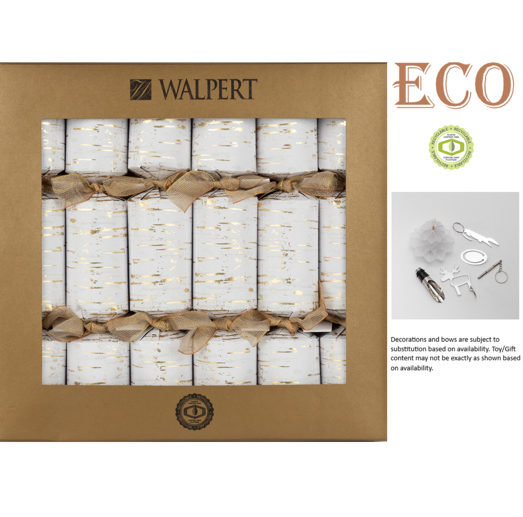 6ct Gold Birch. Celebrate the season with this charming set of 6 festive crackers, perfect for holiday dinners, parties, and gift-giving. Made using sustainably sourced paper and plastic free content, these eco-friendly crackers are designed with the planet in mind. Each set comes in a recyclable box with an open window, making it both a beautiful and responsible choice for holiday celebrations. A classic holiday tradition,each cracker POPS when pulled to reveal a novelty trinket,a cheerful motto or riddle,and a traditional paper party hat—creating a joyful and interactive experience for guests of all ages. Cracker length: 12 inches 6 crackers per box 6 boxes per case Pricing is per box of 6 crackers. Minimum purchase: 6 boxes.