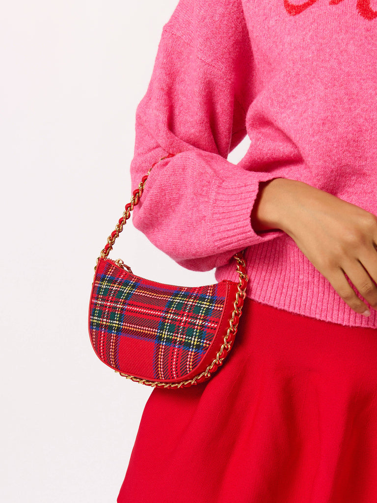 Measures L 8” x W 2” x H 4.75”; Handle 6.5”Made from polyester and wool with gold hardware, The Scottie Handheld Bag is your new holiday plus-one, dressed up in a festive plaid that’s as charming as it is chic. Featuring a single chain-wrapped handle, top zip closure, and one inner zip pocket, it’s made to hold your essentials in style. Whether you choose the bold red or classic navy colorway, this petite crescent silhouette adds instant cheer to any look. It's the perfect finishing touch for party outfits, cozy gatherings, or a gift-worthy accessory moment.