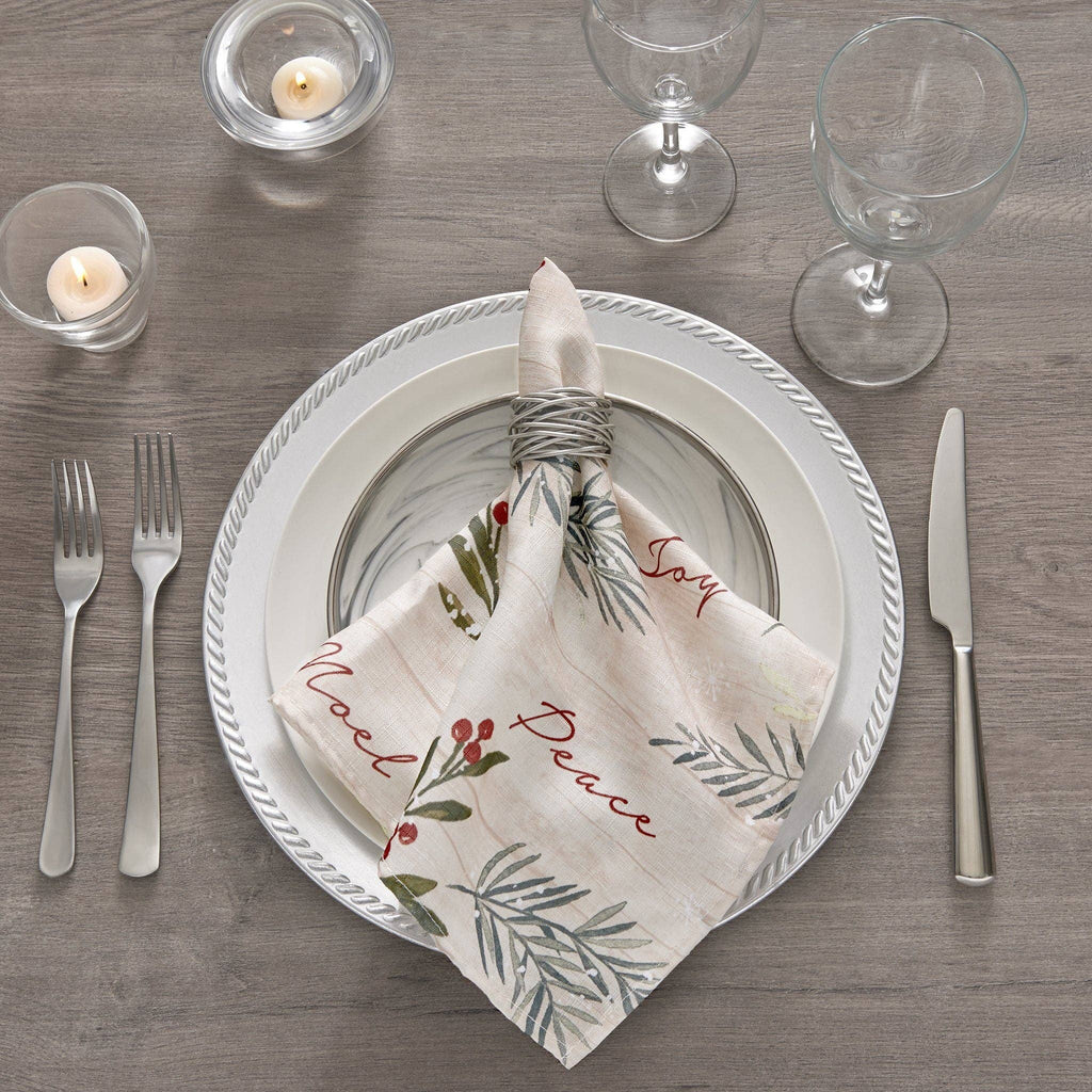 The Holiday Tree Trimmings printed napkin set is the perfect solution to your seasonal decorating needs. Holiday design features a shiplap aesthetic with pine needles, branches, berries and holiday wording. Excellent for special occasions, events, parties, family gatherings and everyday use during the holiday season. Soft and durable fabric can be ironed to release stubborn creases and make your napkins wrinkle free. Hemmed edge adds a finished look and prevents wear and tear.