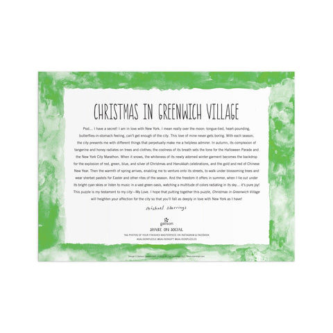 This 1000-piece puzzle showcases Michael Storrings' renowned illustrative style capturing the quintessential holiday atmosphere of Greenwich Village. The composition features meticulously rendered architectural details of iconic brownstones adorned with seasonal decorations, set against a backdrop of New York City's distinctive urban landscape. Each precision-cut piece contributes to a challenging assembly experience, with Storrings' signature use of color gradients and intricate detailing providing both visual cues and strategic complexity. The completed puzzle measures approximately 20" x 27", offering an excellent representation of this celebrated artist's work that captures the nostalgic charm and festive ambiance of a Greenwich Village Christmas.