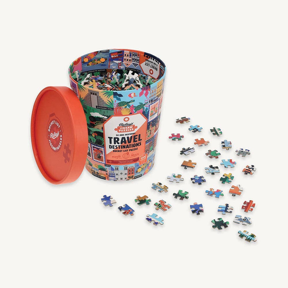 As you piece together this Travel Bucket List 1000 Piece Jigsaw Puzzle from Ridley's Games, you'll discover incredible destinations to add to your own bucket list.  Featuring 50 awe-inspiring, beautifully illustrated locales to inspire your next big adventure, once you complete the puzzle, decide where you'll jet off to next: from The Great Barrier Reef to Tokyo, or Patagonia to Cambodia. Once you finish using the poster guide as a reference, why not hang it up on your wall and use it to mark off which places you've been and would like to go next? Packaged in a bucket-style tub and printed on FSC paper with vegetable inks, it's the perfect gift for the jetsetter and travel lover in your life.