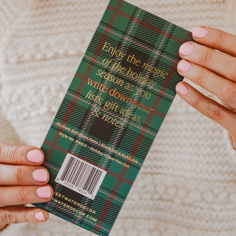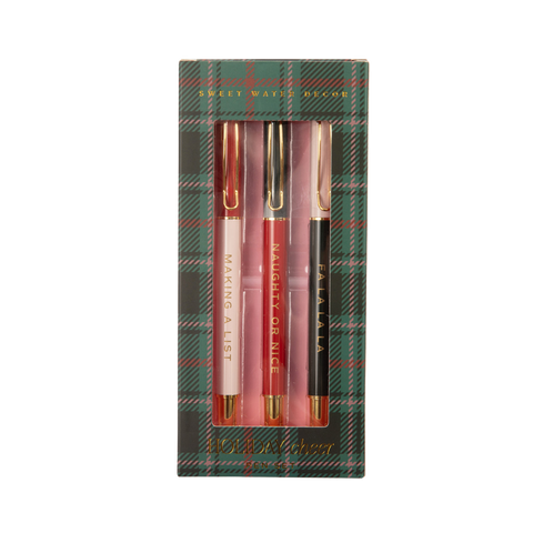 Write out Christmas Cards or holiday gift lists with pens made for the occasion. Customers will love pairing this pen set with our matching Christmas notepads to keep their holiday shopping lists organized. And your Christmas display will look great, too. DETAILS: • Pens Read: Making A List, Naughty or Nice, Fa La La La • Pen Colors: Green, Red, Blush Pink with Gold Accents • Medium Ballpoint Pens | Black Ink • 3 Pens per Set - Each with a Cap • Box Dimensions: 2.37” x 6.25” x 0.75” • Pen Dimensions: 5.37” • Ink Refill: Parker Medium Ballpoint Refill (or similar brand) • Packaged in a Plaid Box with Gold Foil Accents • Designed in the USA,