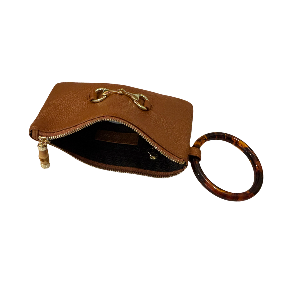 Your customers will swoon over this pebbled Italian leather clutch with tortoiseshell handle. A true statement piece! Main compartment zipper closure with bamboo pull. gold horse bit accent. Measures 8.5" x 5" without handle. Accommodates phone, keys, lipstick, and much more.