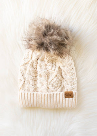 Beige cable knit pom hat Pairs with matching mittens M-381 Natural faux fur pom accent Fleece lined 100% Acrylic Min. Qty. 2