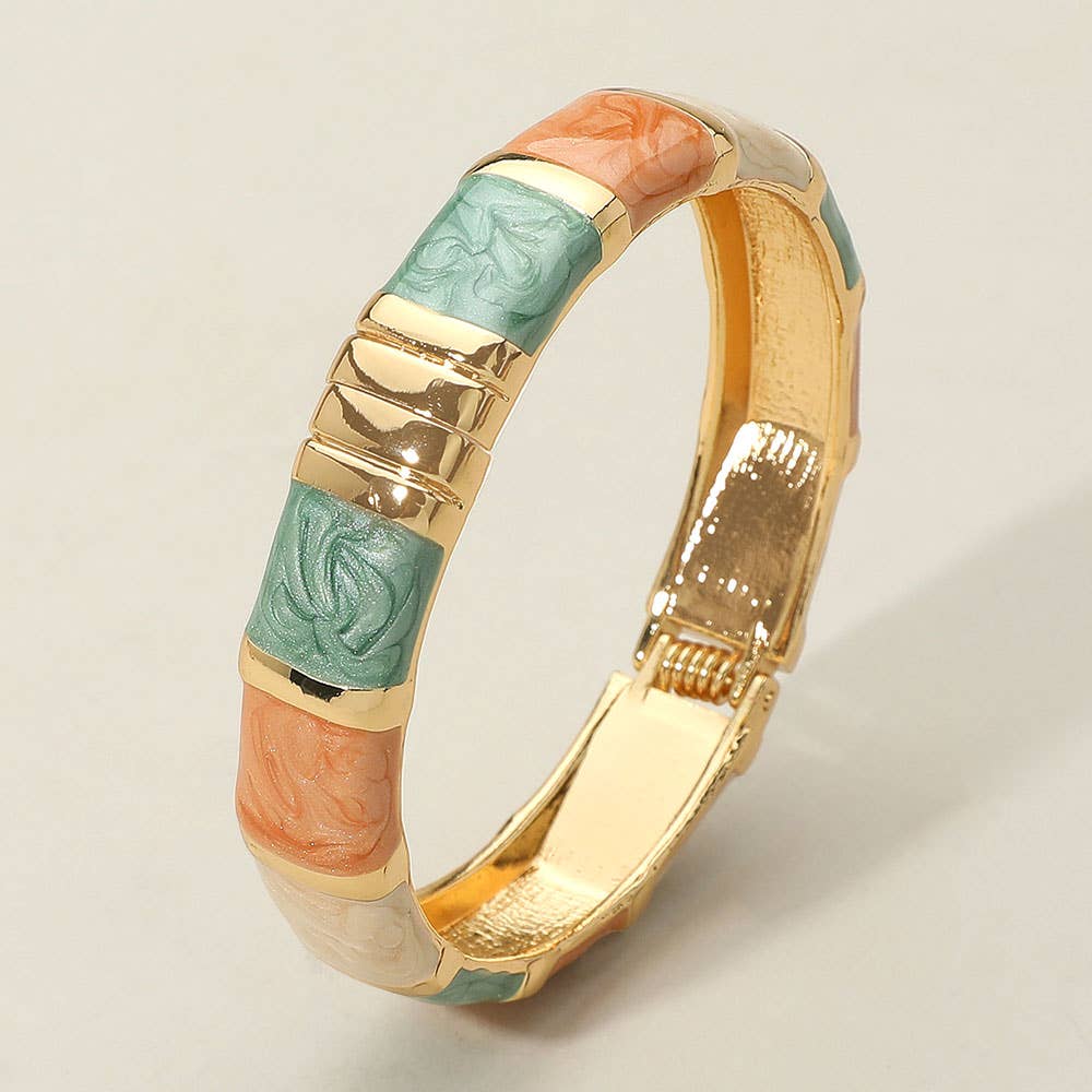 Enamel Bamboo Hinged Bangle Bracelet • Size : 0.5" H, 2.4" D • Hinged Closure • Lead and Nickel Compliant Vintage-style enamel hinged bracelet featuring soft gold-tone accents. A chic statement piece perfect for retro and boho looks.