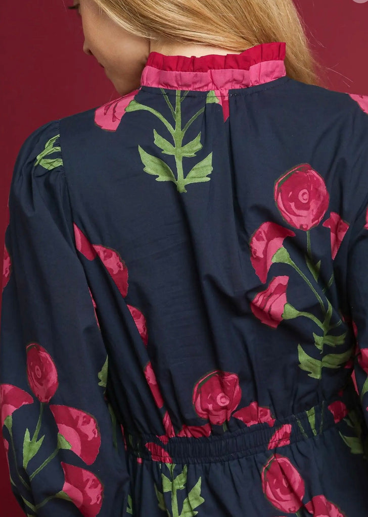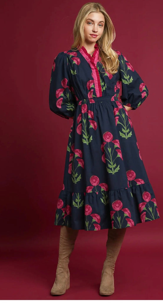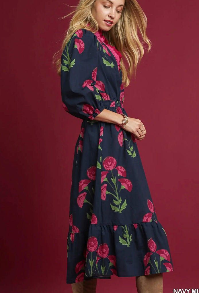 Floral Midi Dress with Ruffle Trim and Elastic Waist