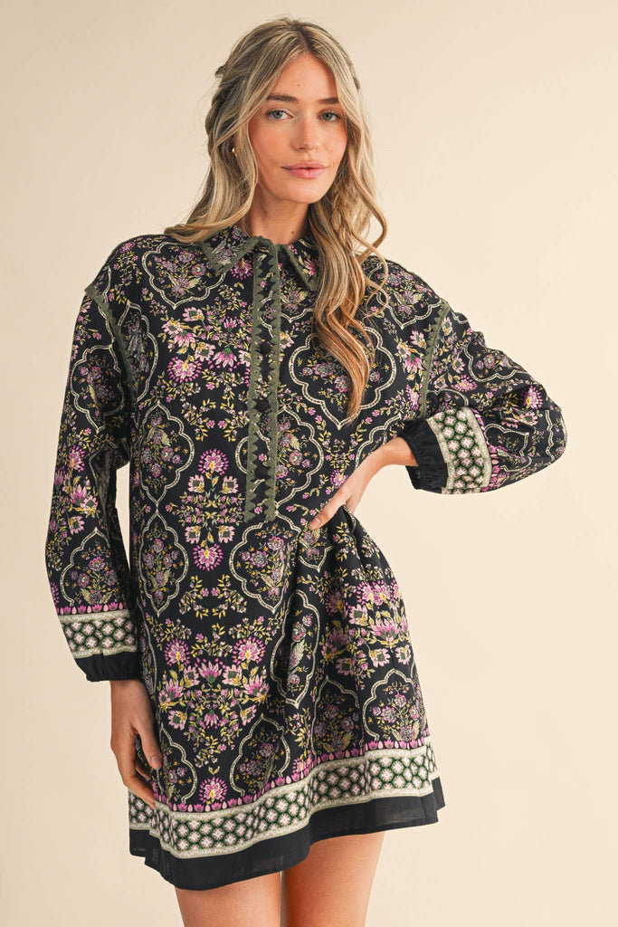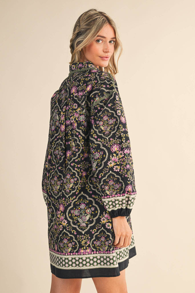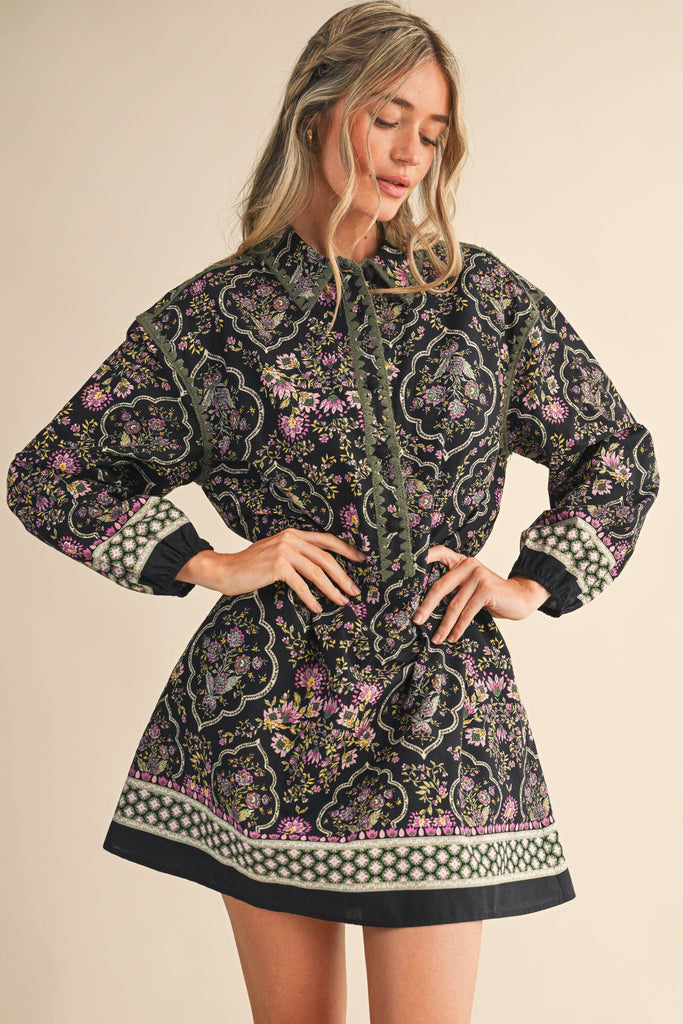 Blanket triangle stitch button down mini dress + Collared neckline with contrast blanket triangle stitch + Half button down placket with contrast blanket triangle stitch + Crochet covered buttons + Drop shoulder long puff sleeves with elastic cuffs + Blanket triangle stitch on shoulders + Pockets + Lined + Model is 5' 10.5" 32-24-36 and wears a S