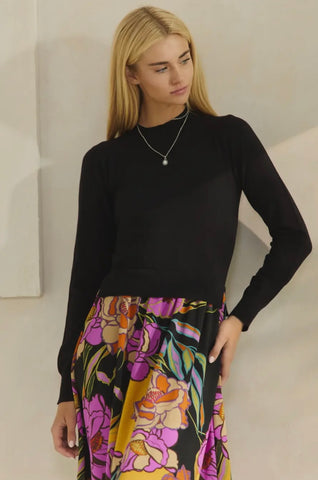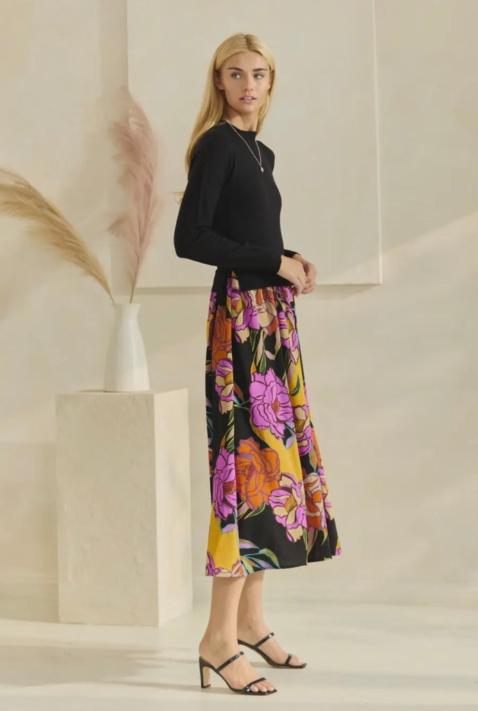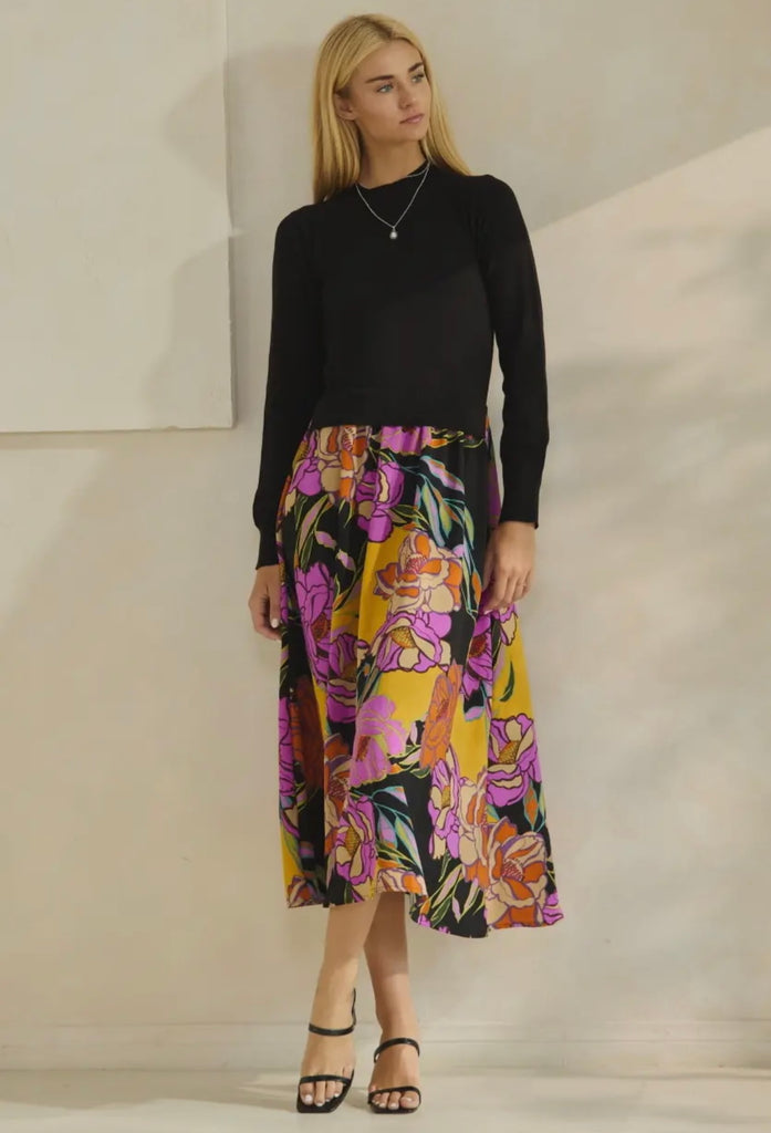 Long sleeve high gauge sweater top and floral printed skirt dress.