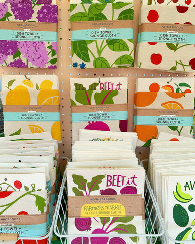 Our Mint gift set includes one of our signature dish towels and a matching Swedish sponge cloth. It can handle all kitchen (and gifting) needs and makes cleaning up cute with less waste. Comes with a belly band label that quickly tells what is included in the set and shows the full designs on the back. • Packaged set measures 7" x 8.25" x .75” TOWEL • Each towel measures approx. 24"x26" • All natural, unbleached 100% cotton • Machine washable • Hand screen-printed with eco-friendly, water-based inks SPONGE CLOTH • Eco-friendly replacement for kitchen sponges and paper towels • Sponge measures 6.8” x 7.75” • Made of 100% biodegradable (and compostable) material • Hole on top to make it easier to hang by the sink + display in your shop • Screen-printed with water based, eco-friendly ink • Lasts for months and can be cleaned in dishwasher or washing machine • Soft and pliable when wet, and dries quickly in between uses