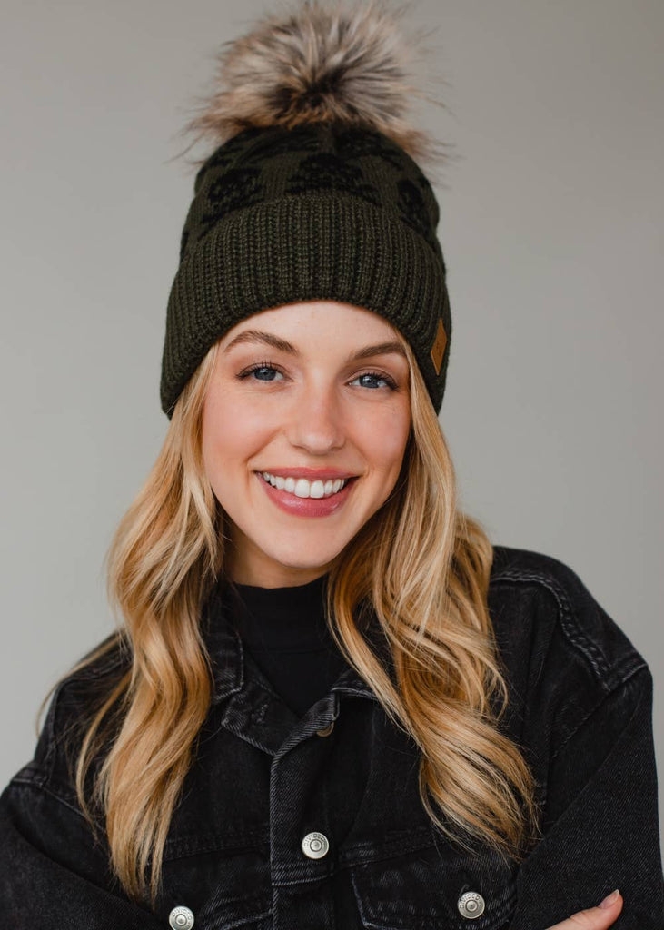 Olive skull pattern knit hat Pairs with matching mittens M-285 Fleece lined Natural faux fur pom accent 100% Acrylic Min. Qty. 2