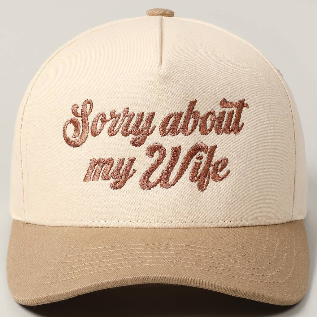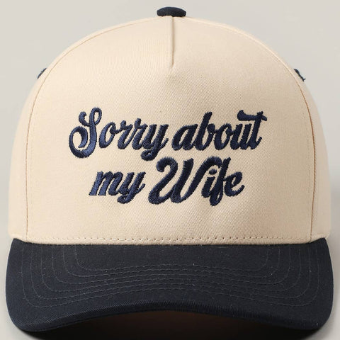 Sorry About My Wife / Husband Embroidery Cap - Sorry About My Wife, Sorry About My Husband Fun Text Embroidery - 5 Panel Trucker Hat Canvas Cap - 100% Cotton - Adjustable Buckle Closure - Embroidered In USA *One Size Fits All - Adjustable Strap Makes Fit Comfortable.* Celebrate your love with our husband-wife matching embroidery caps! Crafted from high-quality materials, these stylish caps feature adjustable straps for a comfortable fit. Each cap showcases a unique embroidered design that symbolizes your bond—perfect for outings or casual days. Available in versatile colors, they complement any outfit and add a playful touch to your look. Ideal for anniversaries, weddings, or just because, these caps are a sweet way to express your connection. Wear them together and let the world know you’re a team, one stylish cap at a time!