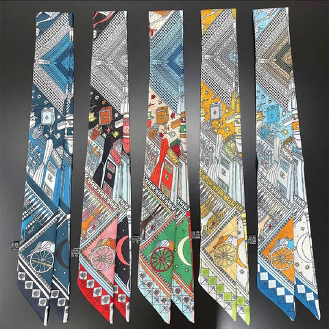 Vintage prints: Light Weight Twilly Scarf - Stylish Scarf to Wear & Decorate Handbag & Hairstyle - 100% Polyester ** Size: 35"L x 2"W ** Elevate your look with this Cityscape & Architectural Twilly Scarf, featuring intricate linework and artistic geometric designs. Inspired by architectural motifs, this lightweight ribbon scarf adds a creative edge to any outfit. Style it as a chic necktie, playful hair ribbon, wrist wrap, or handbag accent for versatile fashion. Made of 100% polyester, it delivers a silky-smooth texture and comfortable wear. Available in vibrant colorways, it’s a statement accessory for art and fashion lovers alike.